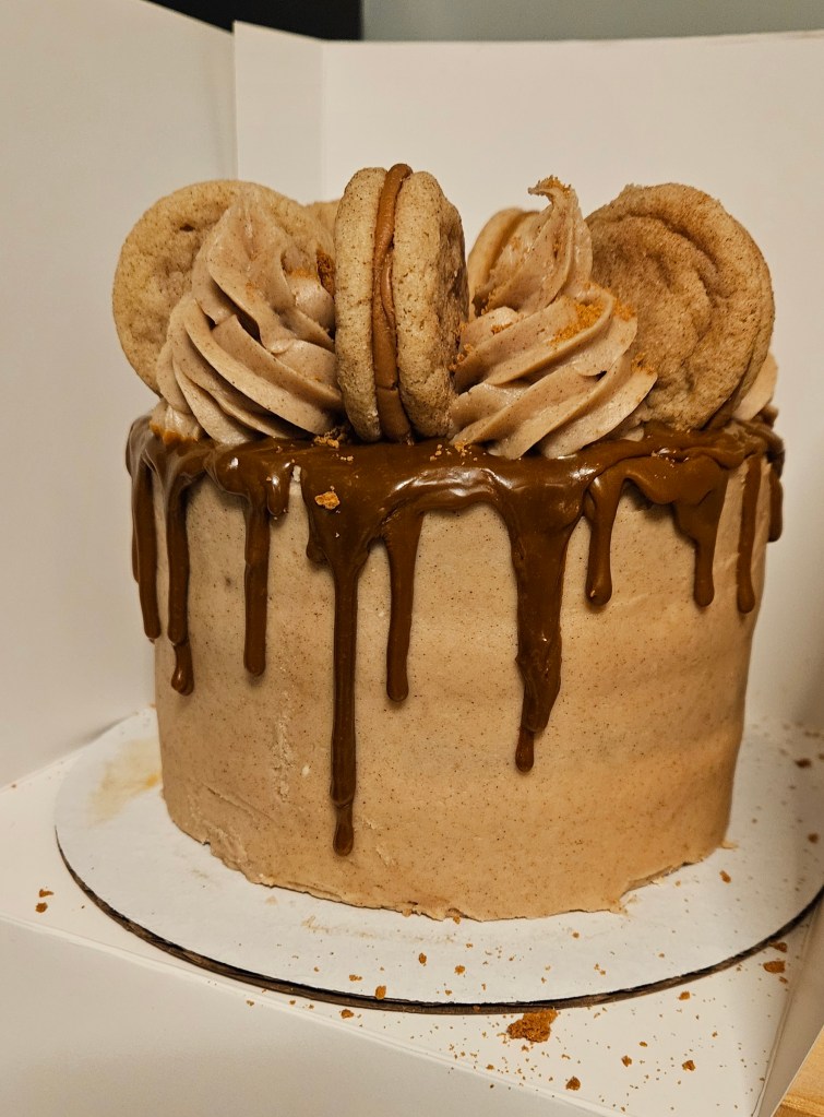 Moist vanilla cake with cinnamon swirl, covered in Cinnamon Cream Cheese frosting, topped with a cinnamon drip and homemade snickerdoodle biscoff sandwich cookies