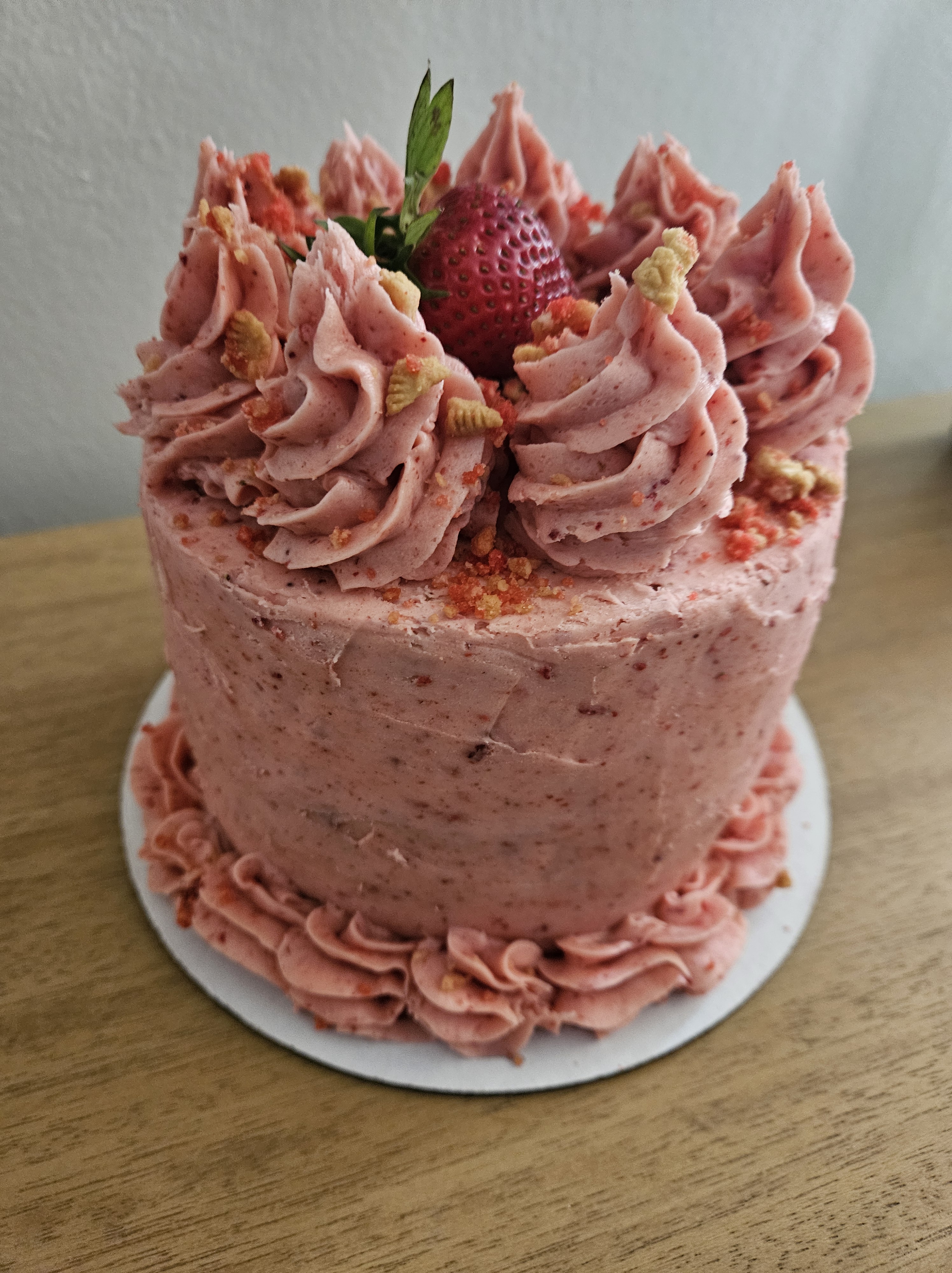 Fresh strawberry cake with Swiss meringue strawberry buttercream, with a strawberry shortcake crunch topping.